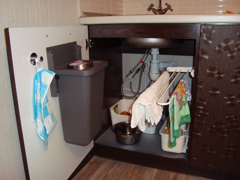 Неееее, я на такие манипуляции не пойду))), ради сомнительного эксперимента , т.к. не очень уверена, что закисать полотенце не будет. Под раковиной стенки нет, пространство больше, но тряпочка, повешенная на крючок на дверцу внутри шкафчика через какое-то время ВОНЯЕТ!