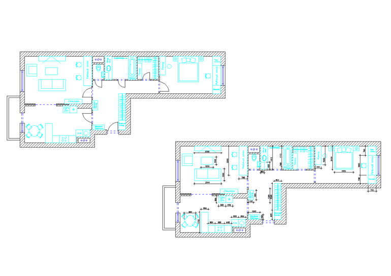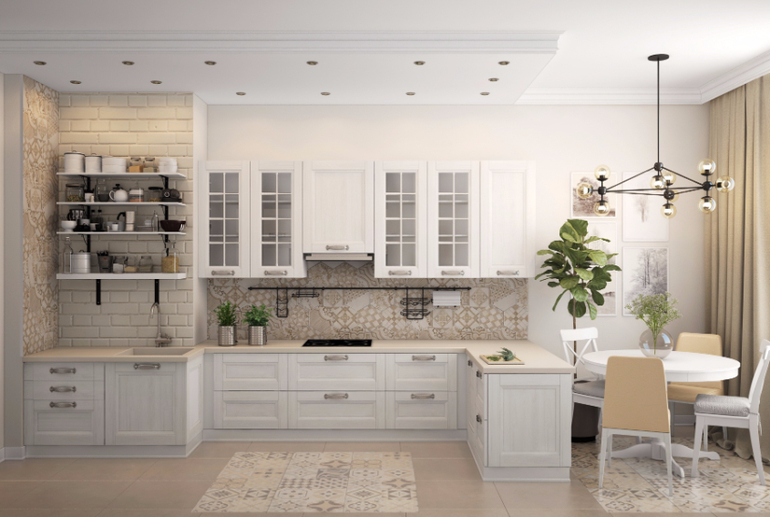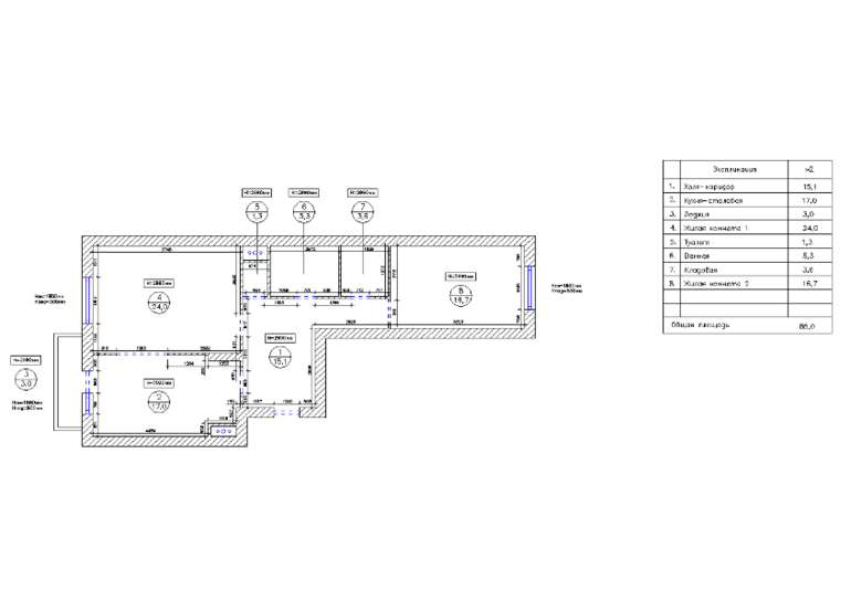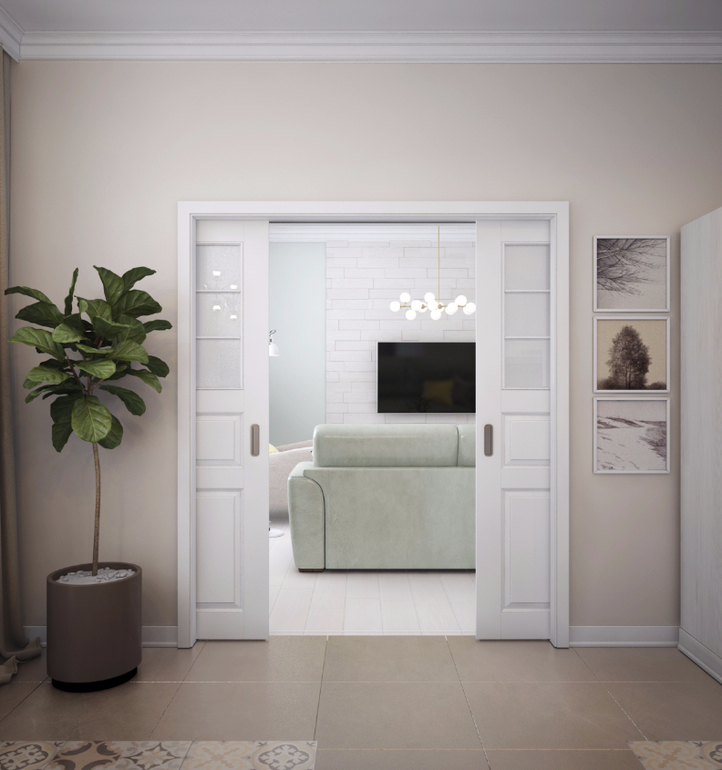 В квартире запланировано объединить кухню (17м2) с гостиной (24м2). Между ними будет стоять дверь-пенал, которая чаще всего будет находится в открытом положении. Кухня, в свою очередь, поделена на рабочую и столовую зону.