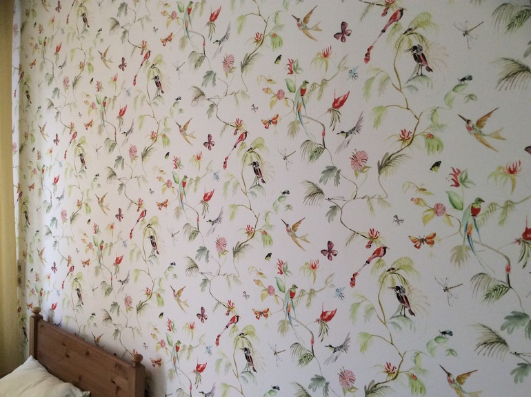 У нас одна стена ими поклеена. Остальный стены другими однотонными. Изначально хотели две стены, но очень агрессивно смотрелось. Стена с птичками самая открытая. По второй стене большое окно, по третьей набор икеевский детский яркого салатового и белого цвета.