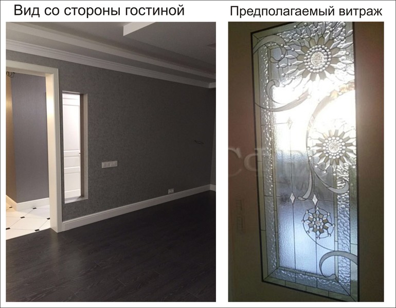2. Сразу, что мы видим, когда заходим в квартиру - большой проем (вход в гостиную). Изначально он был 1,8 м. Мы его сократили и выделили нишу для витража. К сожалению, пока его нет, но вид в целом определен.