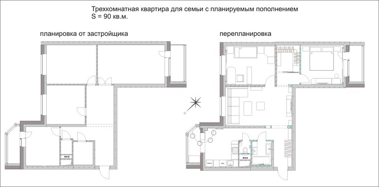 Изначальная задача: была 3х комнатная квартира в новом доме, с планировкой от застройщика. Ее приобрела молодая семья на долгую и счастливую жизнь (в ближайшем будущем планирует пополнение семейства). В целом, заказчики изначально представляли образ: сдержанная холодная палитра, в серо-бело-черных тонах. Любят гостей и хотели, чтобы была возможность их необычным "ремонтом", как они выразились.