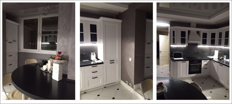 Кстати, попадался вопрос насчет темного фартука. Как видите, смотрится это очень круто при светлой кухни. В обслуживания правда более привередливый, но хозяйка готова за ним ухаживать.