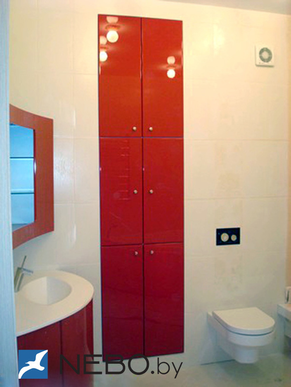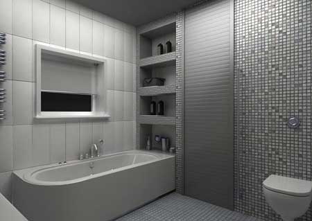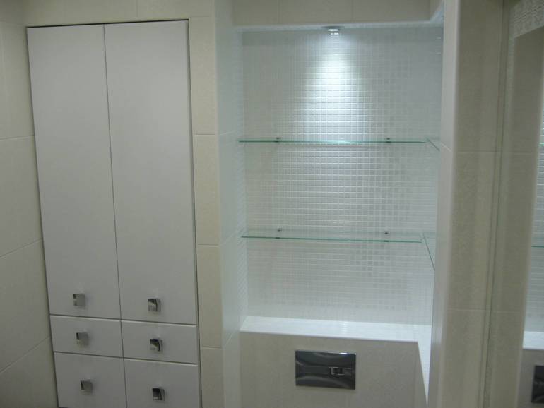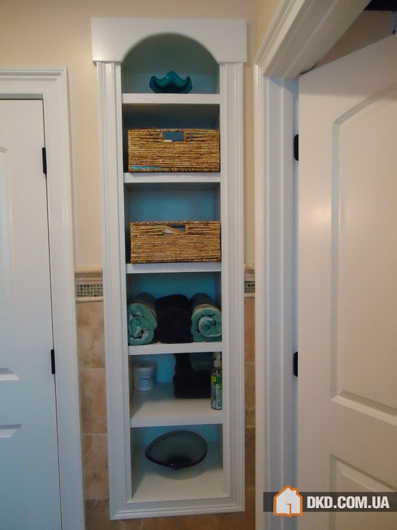 В вашем случае можно сделать одну нишу у ванной с полочками, вторую -шкаф - с дверками (как вариант зеркальными) или открытыми полками, или вообще скрытый