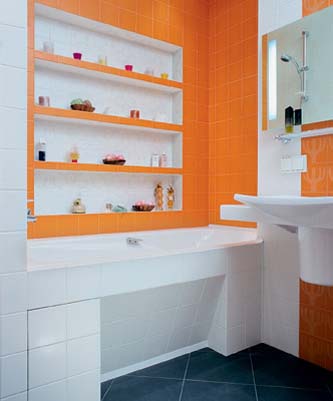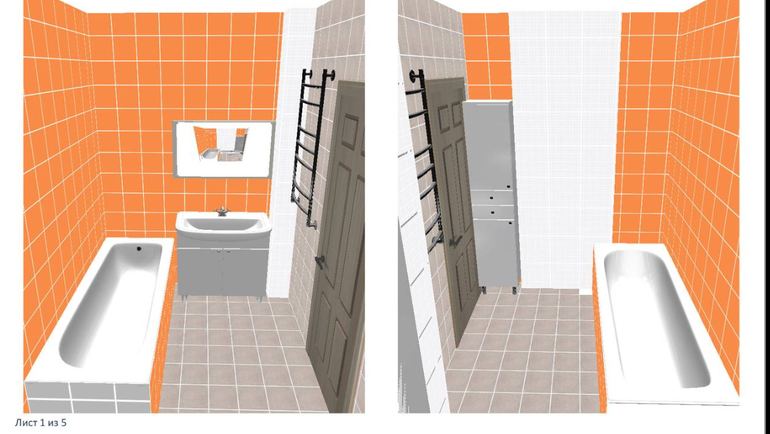 Вопросы и ответыДобрый день! В ванной есть 2 выступающих короба (обозначила белым ). Может подскажите, как можно их обыграть, какую раскладку плитки лучше сделать? Мне на ум приходит только вариант с мозаикой. Оранжевый цвет просто для примера, не окончательный. Расстановка будет именно такой как на картинке.