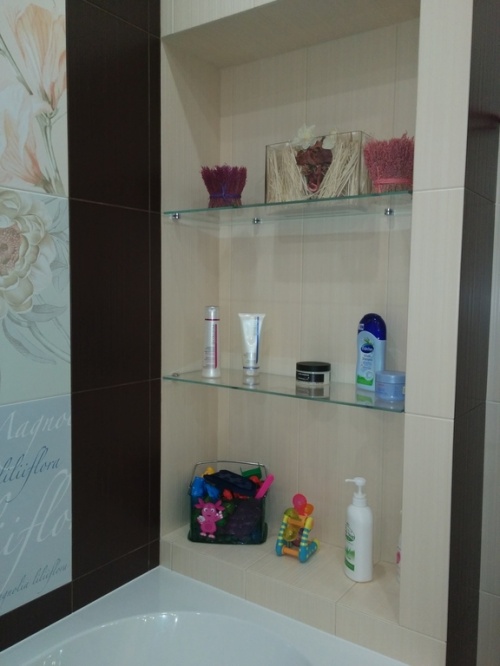 Мы специально делали такие выступы. Плитка сочетание белого и жёлтого, нишу сделали внутри -белую, добавили подсветку и стеклянные полочки. Очень удобно получилось