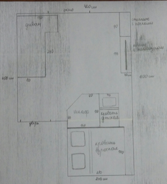 Кровать ребенка и рядом комод, но больше 60 шириной не влезет, если только кровать ребенка вдоль вашей ставить. позже на это место большую кровать для ребенка поставите (вместо комода и маленькой).