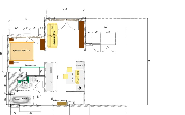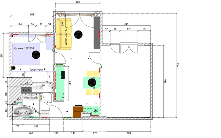 Одну из 2 комнат-дальнюю пока не планируем делать вообще, там позже сделаем детскую, кухню хочу перенести в зал на свой страх и риск. Покрутила в программе, получается мойка будет в коридоре, но все остальное в зале.