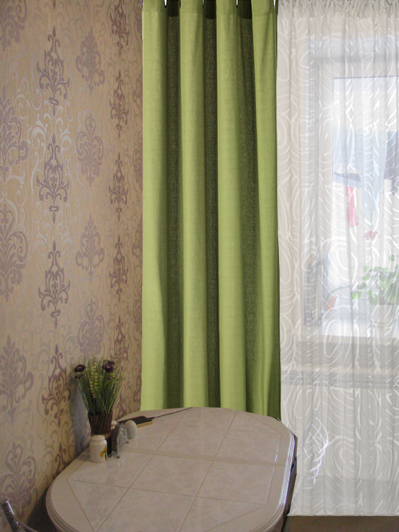 Серебро на окнах сделает помещение холодным и неаппетитным. Надо добавить контраста. Цвет фисташки освежит. Только декор на окна однотонный обязательно, без рисунка. Карниз фозьмите хром (будет соответствовать столу, стульям и ручкам на кухонных шкафах), есть большой выбор наконечников к таким карнизам, и цена у них доступная