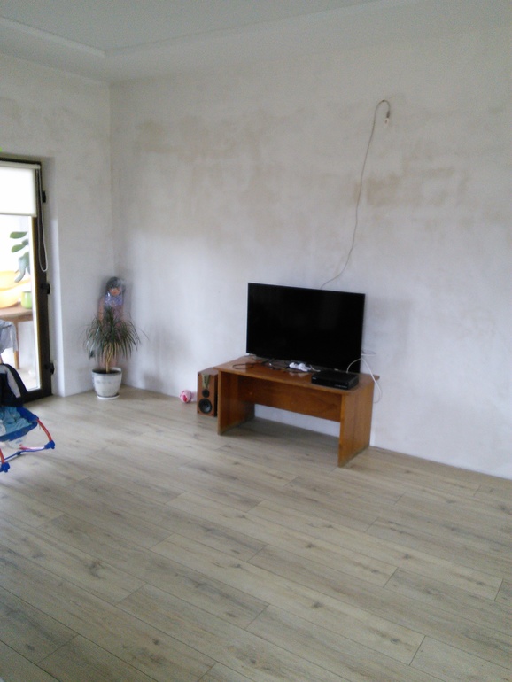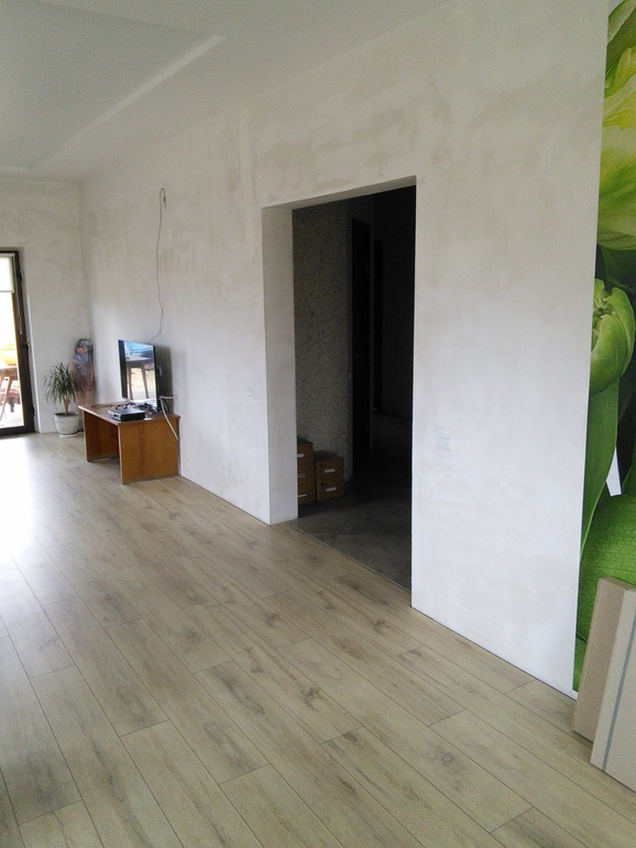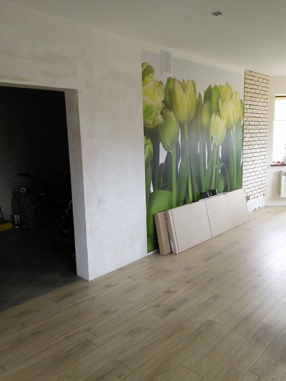 вот и дверной проем слева от обоев тоже будет кирпич и над проемом планировали кирпич переходящий дальше к зоне тв.......