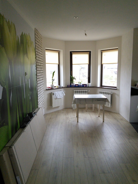 в эркере планируется обеденная группа с круглым столом, слева собственно и есть эта стена уже начали выкладывать на ней кирпич, справа от стола тоже планируется кирпич,