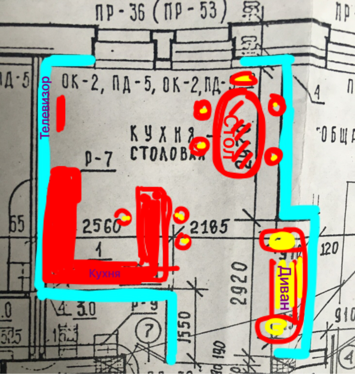 Из мебели есть: диван 235/90, стол со стульями 150/170, (кухня сама + с барной стойкой хочу - куда б вы разместили саму стойку барную?)