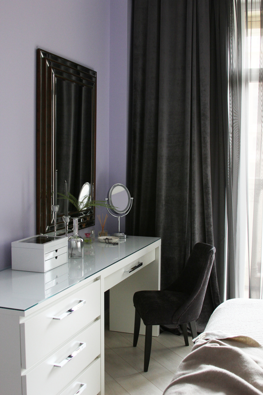 Обычно заказчики не работают дома, однако привыкли даже ноутбуком пользоваться за столом. Компактный рабочий стол мы объединили с вместительным комодом. Проблем с местами хранения в этой квартире нет :)
