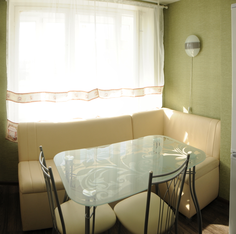 Кухня совершенно преобразилась после переноса двери. Было очень неудобно-длинный вагон, в который невозможно было поставить нормальную кухню. В итоге получилась кухня с двумя зонами: зоной готовки и зоной отдыха с уютным диванчиком (как бонус он тоже раскладывается в спальное место). Обои нашли из остатков в магазине. Разные коллекции, но подошли идеально, как будто специально создавались в тандеме ))) А потом и тюлька появилась тематическая.