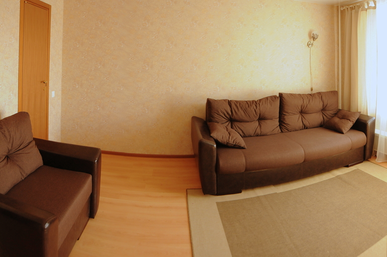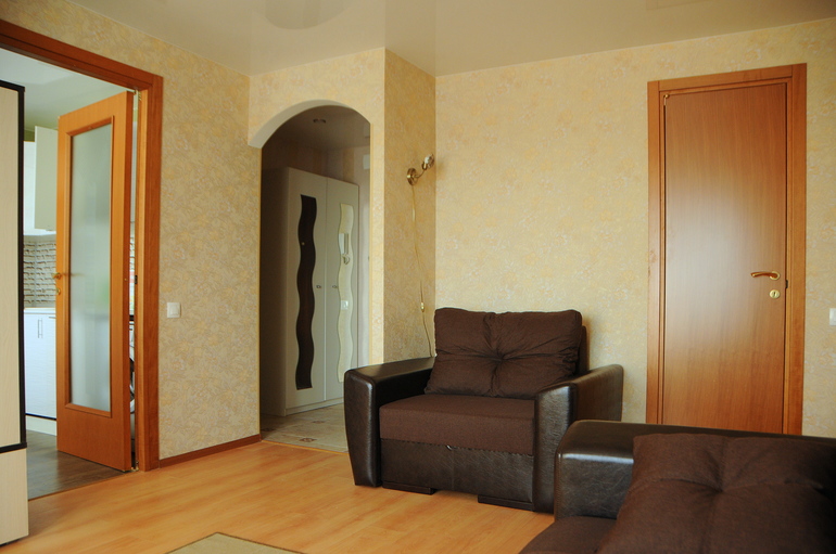 Купили диван (раскладной) и к нему кресло-кровать. Ну и стенка под TV. Все простенько, мебели минимум, чтобы не загромождать прострвнство. Во всей квартире натяжные потолки, так как низковата высота потолков конечно. Взяли глянцевые, эффект просто потрясный! Потолок, который "падал" на голову сразу поднялся, а еще в нем отражаются горящие лампы, очень круто )))