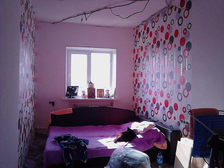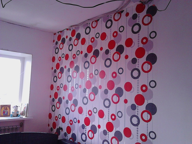 Декор окон. Текстиль. Жалюзи.Дорогие девочки. Посоветуйте какие сюда шторы подойдут. Спальня, ширина от стены до стены 2,5 метра. Планирую двух или трехрядный настенный карниз. Будет светлая мебель (или белая или белый дуб). Половина комнаты с двух сторон оклеена обоями с яркими красными кругами, остальное просто белым. Думаю может подойдет легкая тюль, а портьеры двухцветные: по бокам красные а в серединке белые? Как вы считаете? Посоветуйте, как на ваш взгляд красиво оформить окно. Может какие-то другие цвета посоветуете?