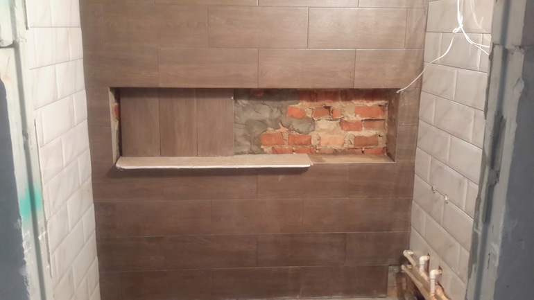 А может вообще сделать мозаику какую-нибудь? Например, белую, под цвет плитки с другой стены. Или бело-коричневую, чтобы оба цвета объединить? мозаика в нишах смотрится очень хорошо.
