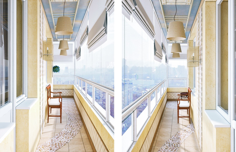 8. И самое любимое помещение в этой квартире - лоджия. Изначальные варианты были совсем другие, как вы догадались - под стать остальной квартире. Но, вернувшись из отпуска - заказчикам захотелось сделать зону отдыха, с напоминанием о теплых странах. Так родилась эта лоджия. Ширина ее всего 1,2м. Напольная плитка с имитацией гальки - напоминает морской берег, а штукатурка на потолке - голубое летнее небо. На такой лоджии приятно проводить время и в пасмурные московские дни