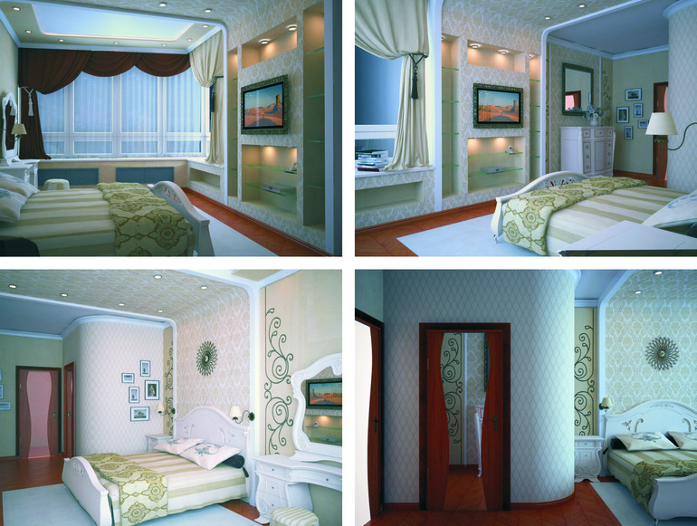 7. Спальня. В спальне тоже достаточно много активных элементов. Это и обои с фактурным рисунком и гипсокартонные конструкции, и сложный потолок. Но, несмотря на такое обилие акцентов, в целом спальня выглядит уютно и располагает к отдыху.