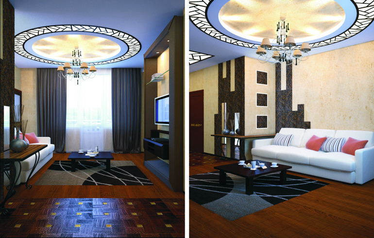 4. Гостиная. В целом, достаточно минималистичная. Минимум мебели, просто посидеть посмотреть ТВ. Центральным элементом стала люстра, точнее конструкция потолка для люстры: световой короб по периметру сочетается с коридором, а штукатурка во внутренней части взята из кухонной зоны. Тем самым, гостиная служит элементом, объединяющим эти две зоны.