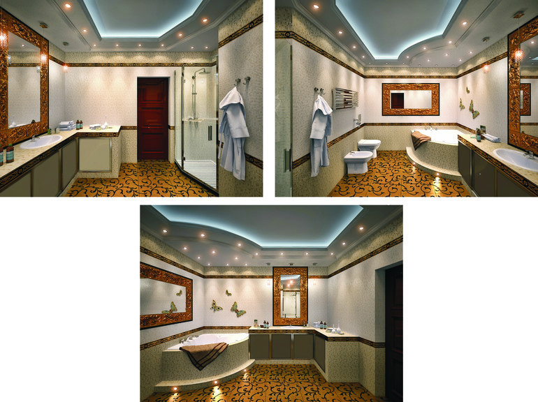 6. Ванная комната. Здесь воплотились все пожелания заказчицы: золото, блестит, много разноуровневого света.