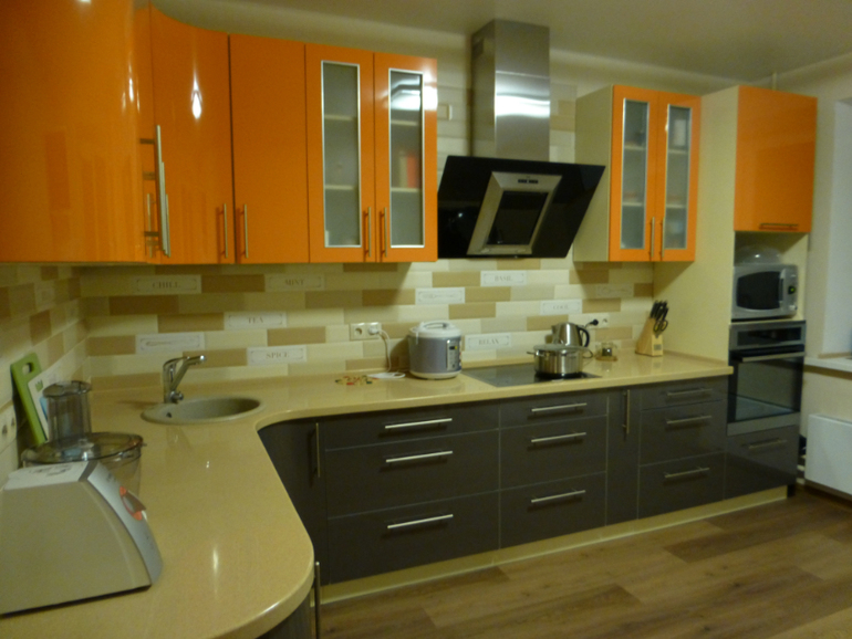 У меня кухня 5 квадратов.Все фасады оранжевый глянец.Столешница и фартук серый.Обои фисташковые.Линолиум и дверь серая.