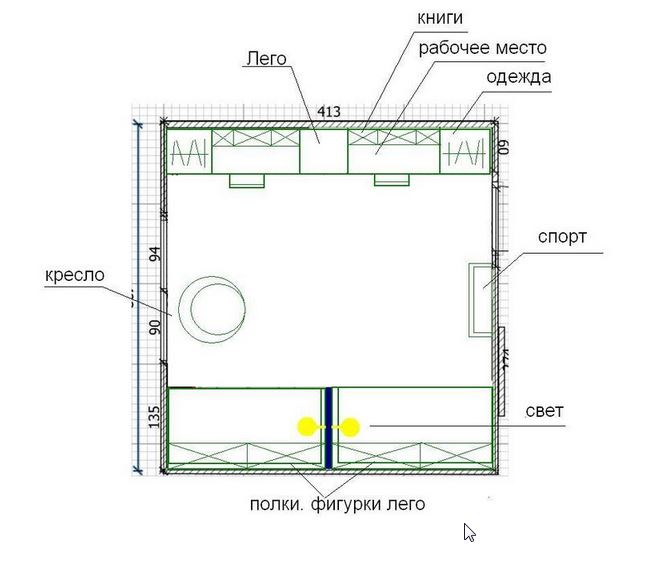 Думаю над детской. Решила последовать советам Анны из моей темки, и сделать детям мебель по одной стене.