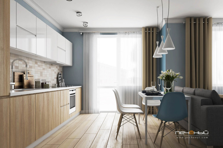 Несмотря на то, что квартира рассчитана для 2 человек, кухонный гарнитур большой и вместительный. А за обеденным столом запросто разместятся 6 человек. Дело в том, что часть обеденного стола планируется для использования в качестве места для кратковременной работы на ноутбуке.