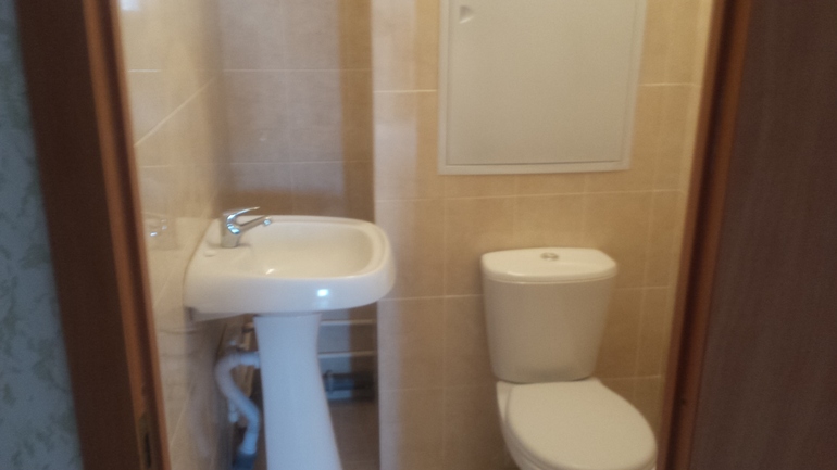 То, что за унитазом-сантехнический короб из гипсокартона. Рабочие предложили его уменьшить по максимуму, чтобы слева влезла стиральная машинка. А раковину сделать маленькую угловую.