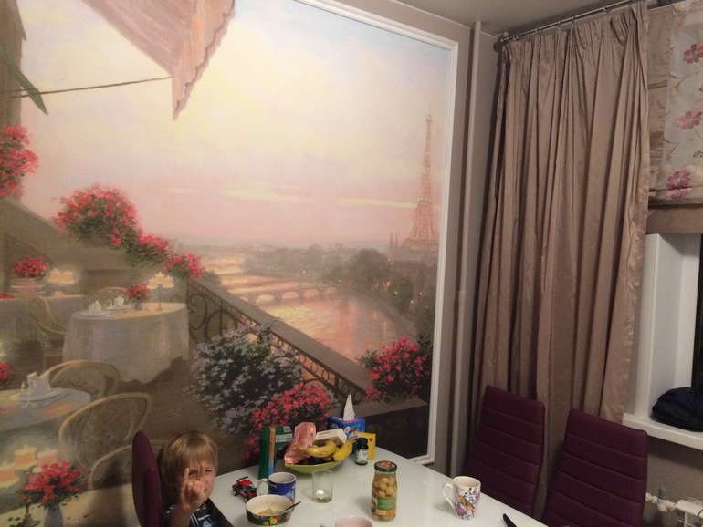 Фреска конечно не в тему. Ручки бы поменяла на прямые без вычура. Кремовые занавески замерила