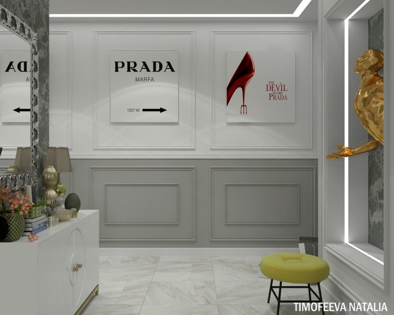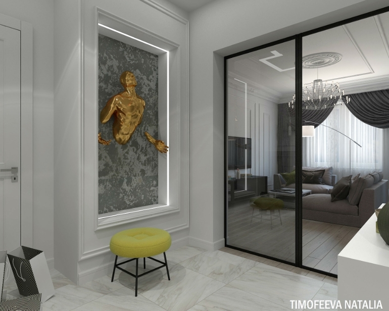 Очень красиво, необычная картина скульптура, световые полосы на потолке такие, как у нас:)) но вот молдингов многовато, чуть-чуть меньше бы сделала.