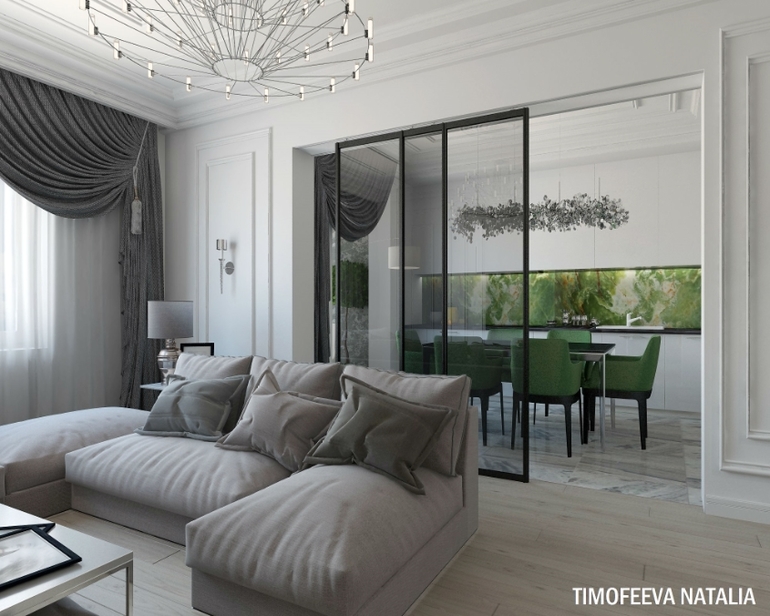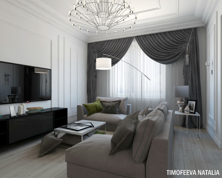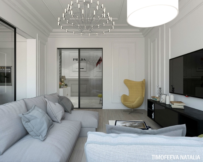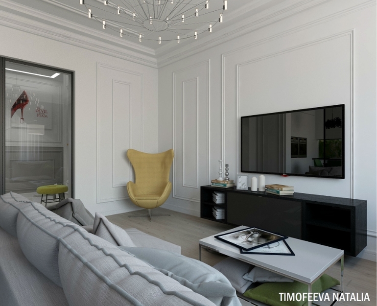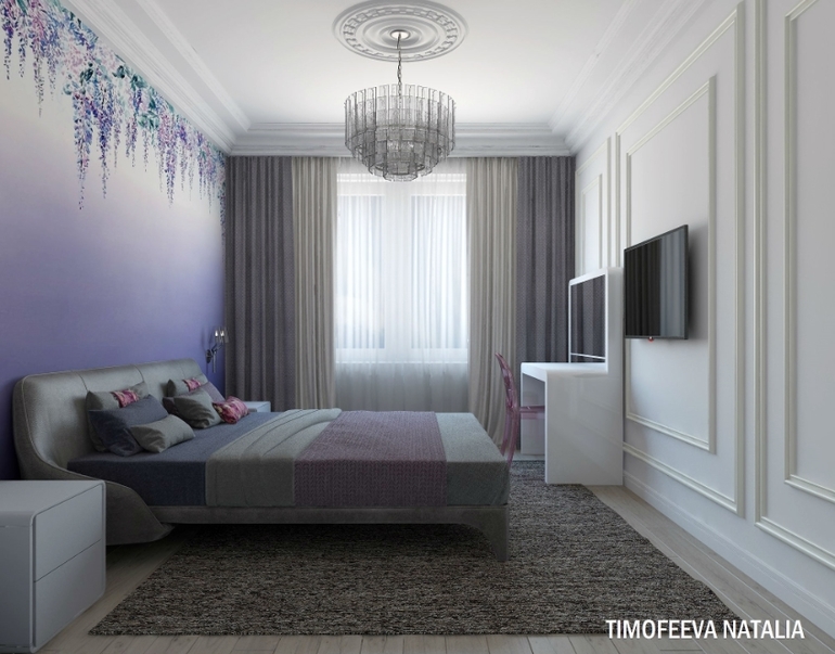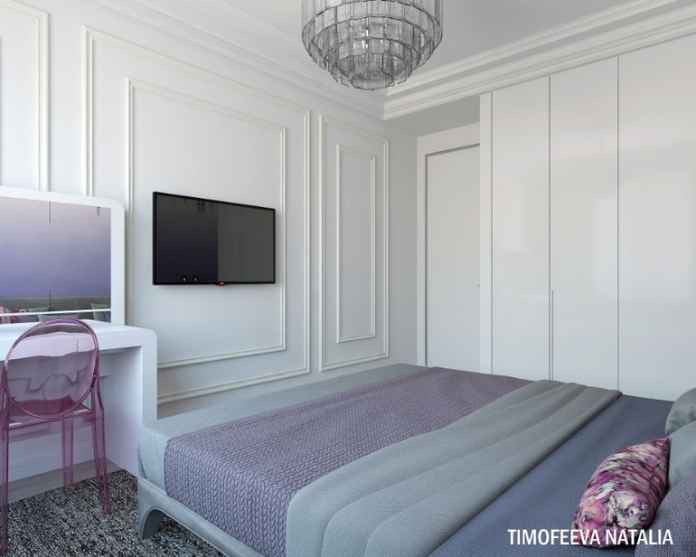 Мне кажется, можно было столик в спальне сделать меньше, он бы не перекрывал ТВ зону (где молдинги) и проход к кровати был бы не такой узкий.
