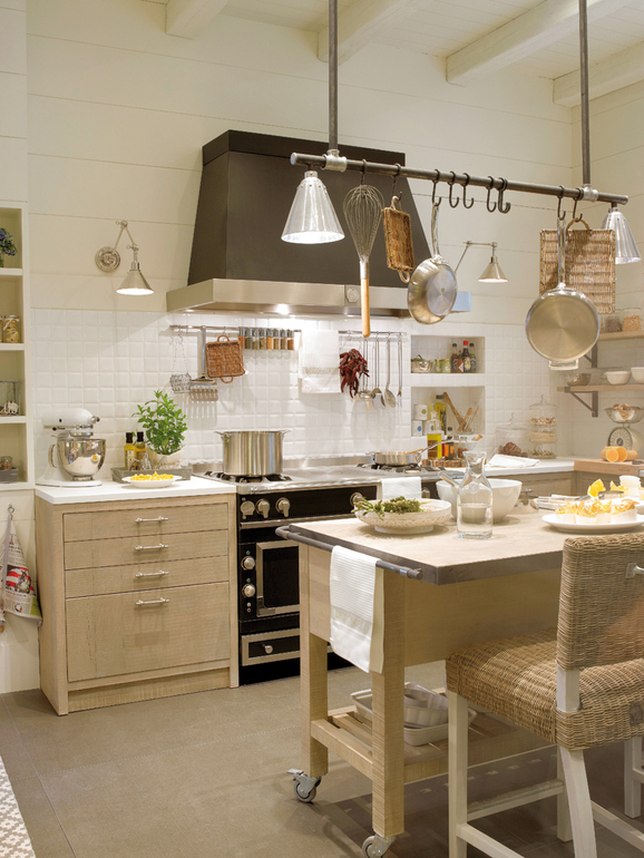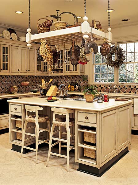 Их очень любят использовать в загородных кухнях в Англии, США, Франции, но почему то у нас они до сих пор не очень прижились. Такие навесы не только декоративны сами по себе, они еще и очень функциональны. На их крючках можно разместить металлическую посуду (сковородки, кастрюли и пр.), всевозможные кухонные принадлежности, повесить пучок пряных трав, цветов, связки чеснока, перцев и т.д. Это сразу же придает кухне уют и шарм загородного дома.