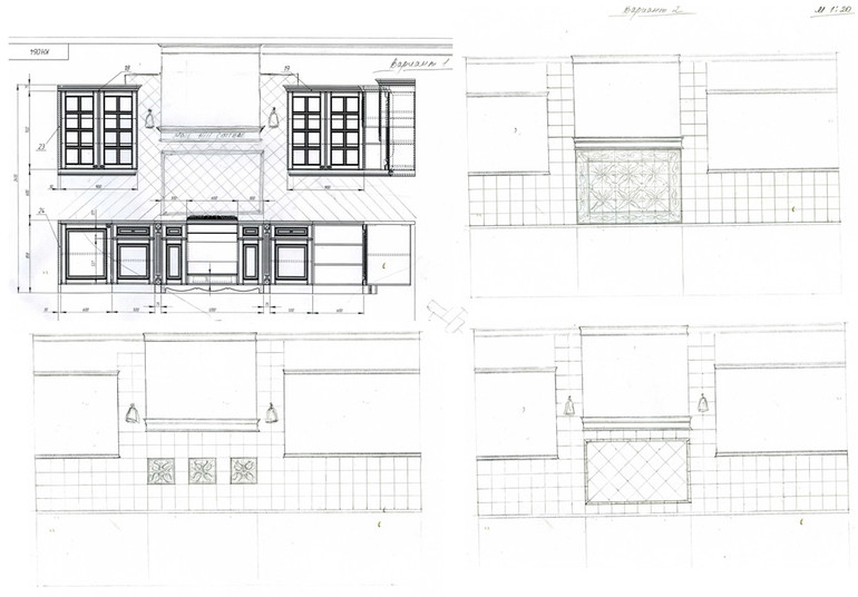 Это тот случай, когда заказчикам не нужна была 3D визуализация всей кухни. Им достаточно было коллажей, разных эскизов от руки и конечно же чертежей для строительно-отделочных работ.