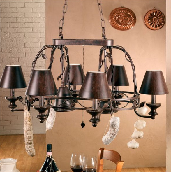 В нашем случае удалось отыскать кухонную люстру, которая являлась одновременно и светильником, и навесом (2 в 1). Хозяйка просто влюбилась в нее. Ну а сама люстра задала тон всей кухне, вокруг нее все закрутилось.