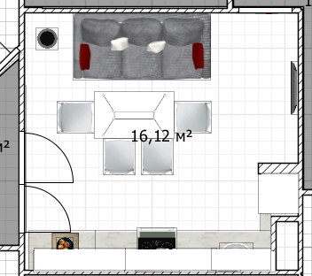 Я не дизайнер, я просто мимо проходила, но выскажусь. По моим ощущениям прям кухня получается, от гостиной совсем ничего нет. Вы уверены, что нужна рабочая поверхность 4 погонных метр, да еще и доп. угол? У меня спальня 4.3 на 3.6 представила там кухонный гарнитур на всю стену - прям большущий, он точно вам такой нужен? (у меня длина кухни 2,6 и плюс один стол стоит углом - для меня прям более чем достаточно (но у меня нет посудомойки), хотя один шкаф нижний - полупустой можно было туда поставить). Я бы в вашем случае,поставила бы кухонный гарнитур углом (правый нижний угол); рядом с балконной дверью (левый нижний угол) поставила бы компактный обеденный стол, который раскладывается на случай гостей, и три стула/табурета для вашей семьи. Диван, как на вашем фото или компактный угловой в левый верхний угол. Во время прихода гостей стол раскладывать и ставить к дивану. ТВ так как у вас оставила бы. Так разделилась бы зона кухни и зона гостиной. В Вашем варианте даже не представляю когда вы собираетесь пользоваться диваном. Как то так