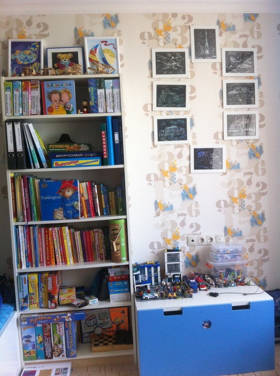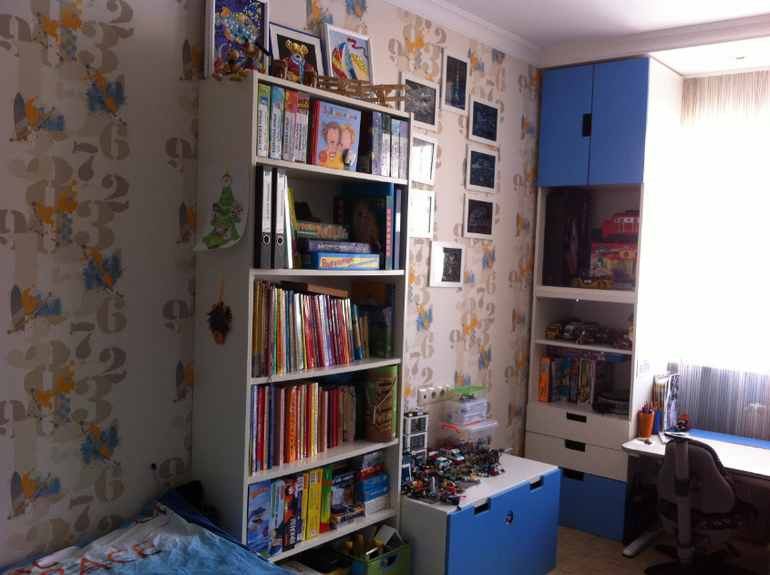 Отдельно стеллаж для книг и игр, стол для лего, хотя большая часть убрана вообще.