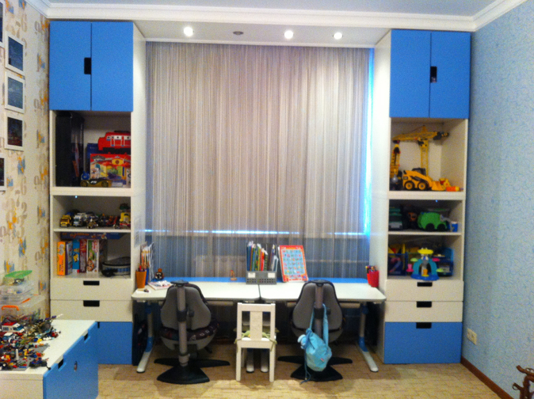 Столы - Бюрократ, стулья (тоже Бюрократ КD-2) но тоже ростут с детками. Очень удобно такое расположение, я сажусь по середине, и есть возможность заниматься одновременно с обоими детьми.