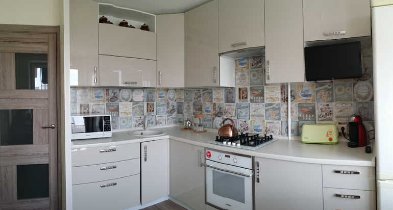 Спасибо! Фальшстена, к сожалению, обусловлена планировкой квартиры (в нее упирается дверной проем на кухню). Она по умолчанию была, но короче - я удлинила, чтобы вровень с гарнитуром было. В идеале я очень хотела, чтобы ее не было, и можно было закруглить конец кухни)) На полу плитка Керанова, коллекция форест. Столешница - пластик. Шла в подарок :) Вытяжку вообще рекомендуют делать повыше над газовой плитой, + хотела побольше фартука на обозрение выставить))) По поводу внутреннего содержания пока похвастать нечем - все пусто))) пока разгребаю последствия ремонта, мою, руки не дойдут до обживания)) А куда бы Вы поставили телевизор? У нас он там висел всю жизнь до ремонта, я решила так и оставить. Привычно и удобно)