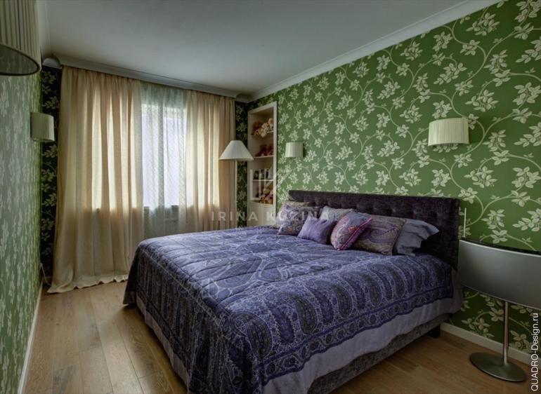 Вот пример реальной спальни с активными обоями. Но тут история была такая: хозяйке очень понравились эти обои и засчет светлого крупного узора, они не давят на человека и не уменьшают пространство, в отличии от темных обоев с мелким золотым рисунком