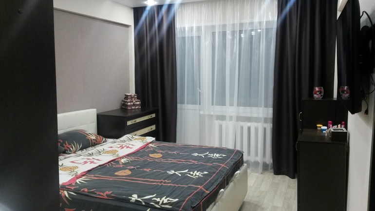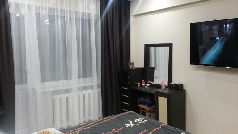Шторы блэкаут, они цвета венге, темно коричневые. Потолок натяжной со спотами, вряд ли я уже смогу что-то по менять