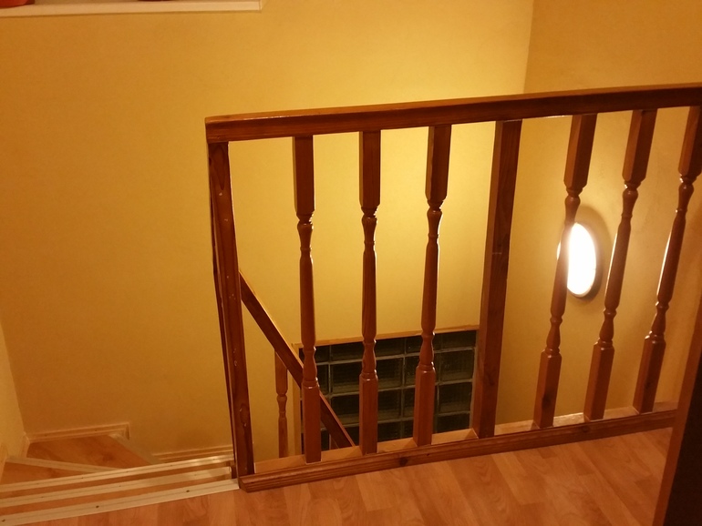 Мой ребеночек еще не ходит, и даже не ползает, но я уже задумываюсь о безопасности в доме. Подскажите, пожалуйста, как можно обезопасить такую лестницу? Ворота, понятно, поставлю, а вот эти перила с дырками между деревяшками?