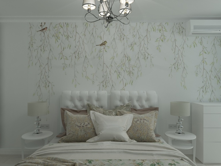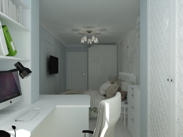 Площадь спальни вместе с присоединенным балконом составила 15,4кв.м. Заказчики решили сделать шумоизоляцию стены с соседней квартирой. К сожалению, из-за этого ширина спальни уменьшилась на 10см. Кровать,которую выбрали заказчики длиной 2,2м и в итоге до стены остается 20-25см. Это единственный "минус" с которым придется мириться. А в остальном спальня получилась спокойная,нежная, располагающая к отдыху и уюту)
