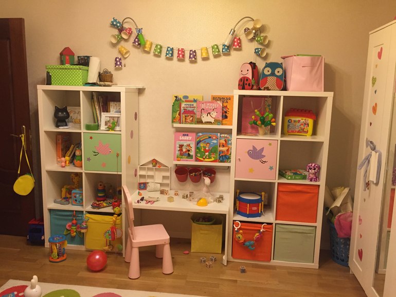 Мы пошли по другому принципу. Хоть дочка и маленькая купили качественную подростковую мебель в мистер дорс, а для того, чтоб ей было интересно сделали наклейки, постеры на стенах, покрывала с принцессами и т.п. Интерьер можно поменять несколько раз в год))) стеллаж в детской мне кажется не очень безопасен, ребенок его может запросто уронить.