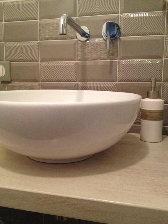 Кабанчик вы нашли тот самый, да. А мозаика фирмы Brix, называется i frammenti. Цвет Dust. Но я думаю, что тут и белый цвет был бы очень хорошо. Долго сомневалась между dust и white. Образцов этой мозаики нигде в Москве не было, поэтому пришлось заказывать по каталогу на свой страх и риск.