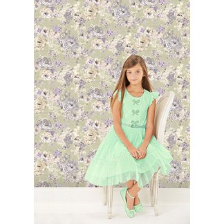 В компаньоны лучше взять в цвет цветочков, лавандовый например. У меня такая же детская, стиль обоев, выбрала в цвет цветочков. В дизайнерской статье вычитала, что берется в цвет цветочков, а не в тон фона.