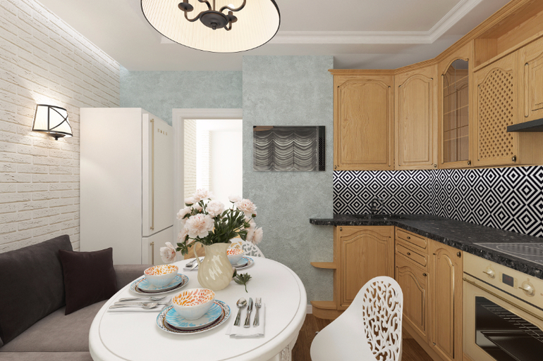 В качестве акцента мною был предложен черный цвет. Практичная столешница из искусственного камня объединила, как мне кажется, до этого немного разрозненный гарнитур. Геометричный орнамент фартука так же добавил яркости и выразительности проекту.