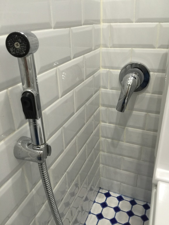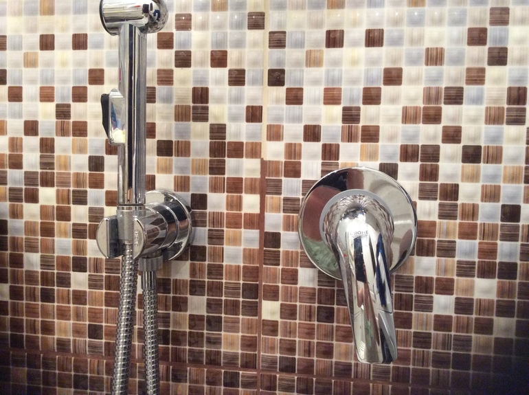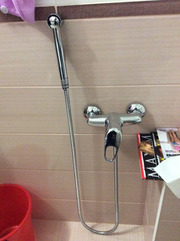 Не могу найти в инете фото в интерьере. Как располагаются держатель шланг и смеситель друг относительно друга?