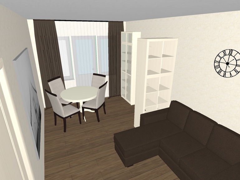 Расстановка точно такая же, как предложила девушка ниже, только диван и телевизор поменяли местами. Телевизор стоит на узком длинном комоде, места от дивана до комода получается больше, чем если бы телевизор стоял в стеллажной секции, изначально планировали просто повесить его на стену.