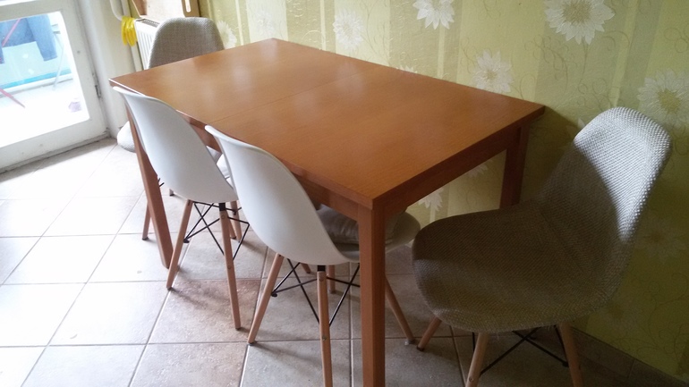 Вы в Москве? Посмотрите столы в хофф! Там были столы шириной 70, раздвижные, цвет столешки как верхние ваши фасады, мне кажется, подошло бы... А еще рекомендую магазин Элбург