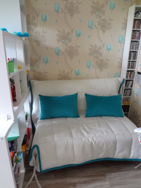 Комната находится на северной стороне, солнышко заглядывает только после 16-17 вечера. Фотки прикладываю. Обои бежевые и бирюзовыми цветами.